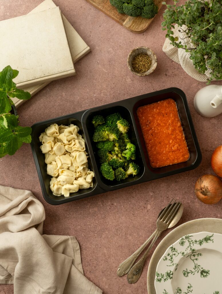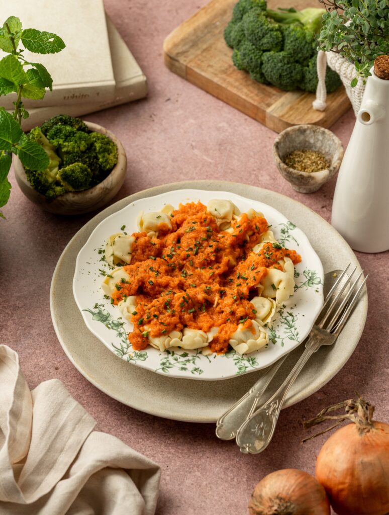 Polnjeni tortelini z mesnim nadevom so kuhani do mehkega in preliti z okusno paradižnikovo omako polno zelišč, ki jedi dodajo znan mediteranski pridih. Dušen brokoli v prilogi je slasten dodatek k jedi, ki ohranja svojo svežino in hrustljavost.