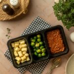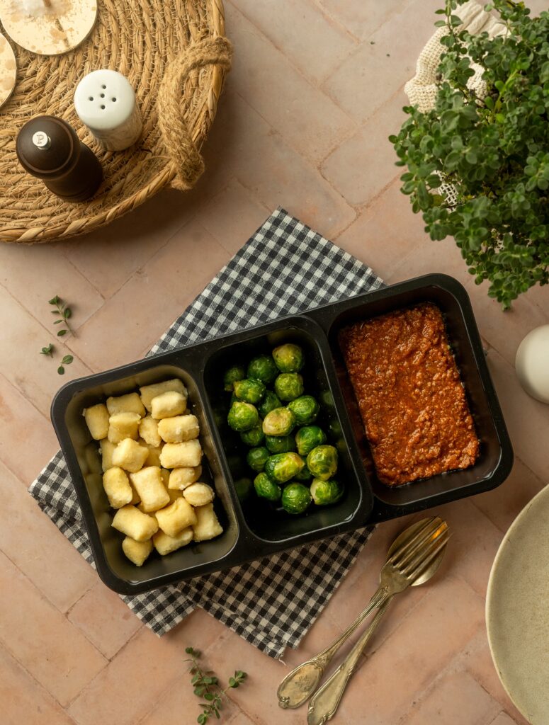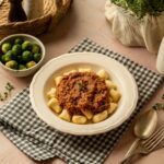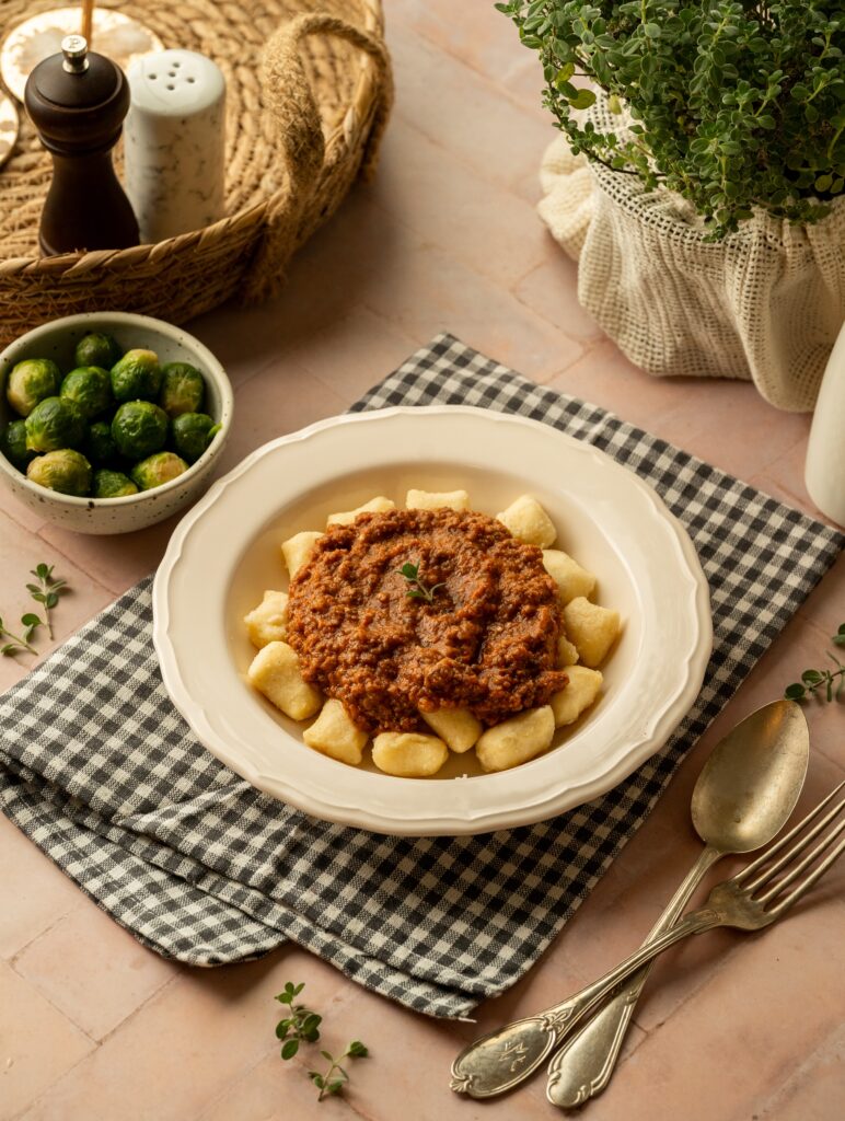 Mehki krompirjevi njoki, preliti z bogato bolognese omako iz mletega mesa in paradižnika, kuhano počasi za poln, domač okus. Kot prilogo dodamo kuhan brstični ohrovt, ki jed uravnoteži in poskrbi za dodatno hranilno vrednost.